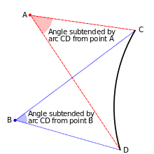 Illustration of the angles subtended by an arc from two points