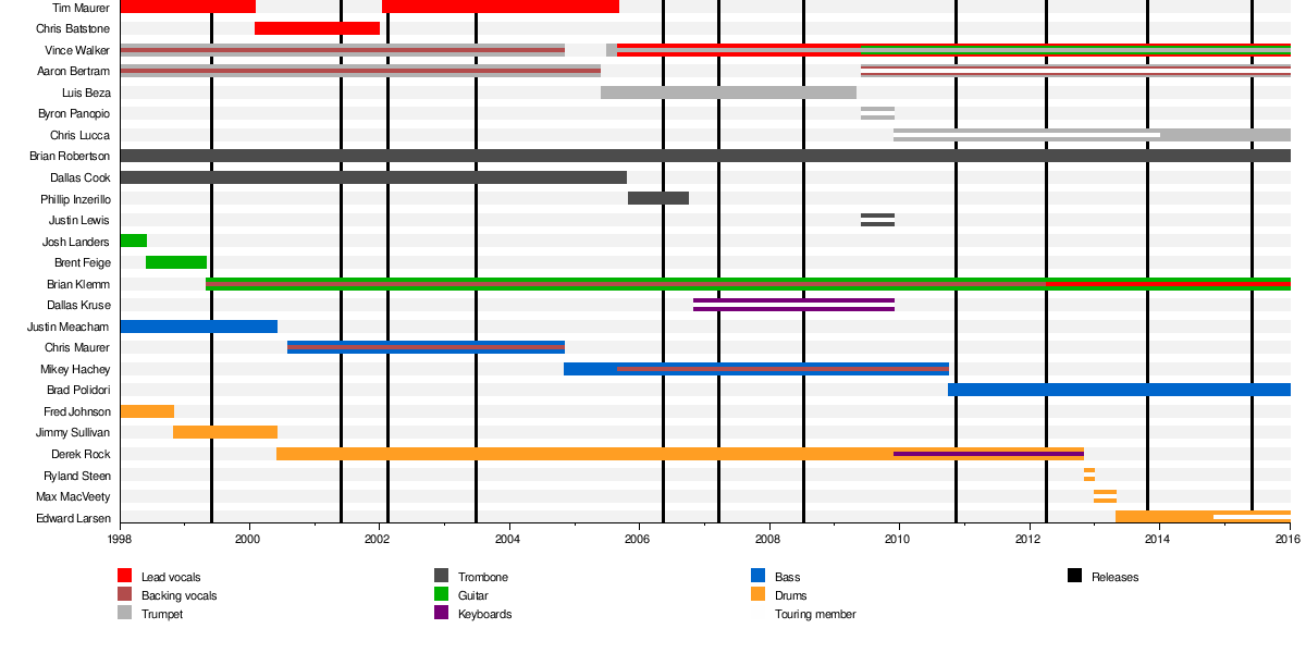 The band has had many lineup changes over the years. Original vocalist Tim Maurer left the band after the recording of Origin Edition, and was replaced by Chris Batstone. Batstone later left the band, and Maurer rejoined. After an album and live DVD, Maurer left again after the 2005 Jerry Lewis MDA Telethon to spend more time with his family. He was replaced by former trumpet player Vince Walker, who returned to the band in the same performance, oddly switching roles from horns to vocals. Walker also plays the trumpet and guitar in some songs on stage. Before becoming the band's lead vocalist, he already had provided lead vocals on several songs such as "Desperate", "Blingity Bling" and "Powerful Game". Walker sometimes switches to guitar so that Brian Klemm can take over lead vocals.