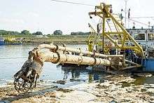 An airlift is a type of small suction dredge. It is sometimes used like other dredges. At other times, an airlift is handheld underwater by a diver.[6] It works by blowing air into the pipe, and that air, being lighter than water, rises inside the pipe, dragging water with it.