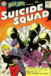 Featured in The Brave and the Bold, the original Suicide Squad team included Rick Flag, Jr., his girlfriend Karin Grace, Dr. Hugh Evans and Jess Bright. This team was created by writer Robert Kanigher and artist Ross Andru.[2] Later continuity[3] established that the team's earliest incarnation was formed to fight monstrous menaces as a replacement for the Justice Society of America, whose members had mostly retired in the wake of unjust accusations during the McCarthy Era.