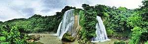 The Cikaso Waterfall (Ciniti Waterfall) is located in Jampang Kulon district, 1.5 hours drive (70 kilometres) from Sukabumi City. The waterfall height is 80 metres; it consists of 3 waterfalls, from left to right Asepan Waterfall, Meong Waterfall and Aki Waterfall.[4]