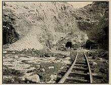 The quicksilver mine was partially an open pit and partially a tunneling operation. Three shafts and a series of lateral tunnels known as drifts comprised the underground works. The shafts were known as the Hermann, the Fiedler and the Parrott.[15] From historical documents it appears only the Wagon-Spring Cut and Bath-house Cut (open pits) and the Parrott shaft were used for mining until 1880. By 1881 the other two shafts were also in place, one of which reached 260 feet (79 m).[20] Bath-House and Parrott flooded then and were not further used.[21]