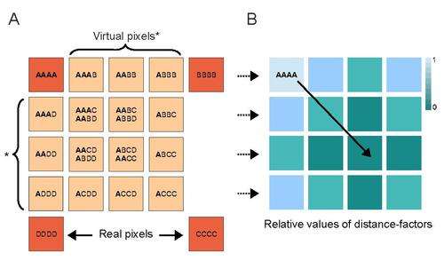 In this equation P denotes the amount of possible partitions, p denotes the different parts of each partition. In addition i is the index for the different pixel positions taken into account during the calculation what for F is just the image stack of the different contributing pixels. The cross-cumulant approach facilitates the generation of virtual pixels depending on the order of the cumulant as previously mentioned. These virtual pixels can be calculated in a particular pattern from the original pixels for a 4th-order cross-cumulant image, as it is depicted in the lower image, part A. The pattern itself arises simple from the calculation of all possible combinations of the original image pixels A, B, C and D. Here this was done by a scheme of "combinations with repetitions". Virtual pixels exhibit a loss in intensity that is due to the correlation itself. Part B of the second image depicts this general dependency of the virtual pixels on the cross-correlation. To restore meaningful pixel values the image is smoothed by a routine that defines a distance-factor for each pixel of the virtual pixel grid in a PSF-shaped manner and applies the inverse on all image pixels that are related to the same distance-factor.[5][7]