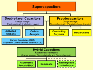 As described above, electrical energy is stored in supercapacitors via two storage principles: static double-layer capacitance and electrochemical pseudocapacitance; and the distribution of the two types of capacitance depends on the material and structure of the electrodes. There are three types of supercapacitors based on storage principle:[11][19]
