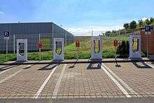 A Tesla station or Tesla Supercharger station is a network of 480-volt fast-charging stations built by Tesla Motors to allow longer journeys for their all-electric manufactured vehicles (Model S and Model X), through quick charging of the vehicle's battery packs. Tesla began building the network in 2012. As of 13 September 2016, there were 705 stations globally, with 4,359 chargers.[1] The Supercharger is a proprietary direct current (DC) technology that provides up to 120 kW of power per car (depending on circumstances),[2] giving the 90 kWh Model S an additional 170 miles (270 km) of range in about 30 minutes charge and a full charge in around 75 minutes.[3] A software update provided in 2015 to all Tesla cars uses demand information from each Supercharger station to plan the fastest route, if charging will be necessary to reach the destination.[4]