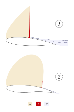 Conventional (1) and supercritical (2) airfoils at identical free stream Mach number. Illustrated are: A, Supersonic flow region; B, Shock wave; C, Area of separated flow. The supersonic flow over a supercritical airfoil terminates in a weaker shock, thereby postponing shock-induced boundary layer separation.