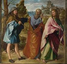 The Road to Emmaus appearance is one of the early resurrection appearances of Jesus after his crucifixion and the discovery of the empty tomb.[1][2][3] Both the Meeting on the road to Emmaus and the subsequent Supper at Emmaus, depicting the meal that Jesus had with two disciples after the encounter on the road, have been popular subjects in art.
