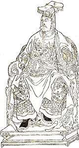 An idealized woodblock print of Yue Fei wearing imperial garb.