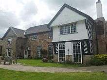 The house is constructed partly in stone, and partly in timber framing, with a U-shaped plan. The arms of the "U" end in irregular gables. The left gable is in stone, and the right is timber-framed. The upper storey of the right gable is jettied, the jetty being supported on brackets carved with wooden figures, one a knight in chain mail. Between the two wings is the former great hall.[2] A 16th century chapel at the rear of the house, which has served at different times as stables and as a convent, now serves as the restaurant kitchens. The house is recorded in the National Heritage List for England as a designated Grade II listed building.