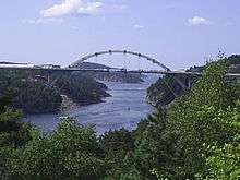 The Svinesund Bridge (Norwegian: Svinesundsbrua, Swedish: Svinesundsbron) is a through arch bridge crossing Iddefjord at Svinesund, and joining Sweden and Norway. Svinesund is a sound separating the Swedish municipality of Strömstad from the Norwegian municipality of Halden, and thus it is the border between Norway and Sweden in this region. The bridge is the westernmost border crossing (and one of the southernmost) between the two countries and carries the European route E6 which is a major traffic route in the area, connecting Oslo and the rest of Norway with Gothenburg, Malmö, Copenhagen and the rest of Europe.
