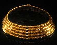 The most noted obejects in the Gold Room collection are the collars dating from around 350–500, made of gold from Roman coins.[21] The room also contains Viking silver jewelry, bejeweled reliquaries from the Middle Ages, coins, ceremonial swords and spoils of war. The large number of preserved objects made from precious metals, is due to a law that was issued in the 17th century, stating that all such finds that were 100 years or older and with no owner, were to be redeemed by the government and sent to the History museum. The law is still in effect.[16]