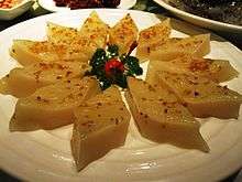 In Chinese cuisine, its flowers may be infused with green or black tea leaves to create a scented tea (桂花茶, guìhuāchá). The flowers are also used to produce osmanthus-scented jam (t 桂花醬, s 桂花酱, guìhuājiàng), sweet cakes (桂花糕, guìhuāgāo), dumplings, soups, and liquor. Osmanthus jam is used as an ingredient in a type of gruel called chátāng (茶汤), which is made from sorghum or millet flour and sugar mixed with boiling water. This dish is associated with the northern city of Tianjin, although it may also be found in Beijing.