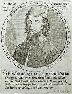 Bernese troops under the command of Sigmund von Erlach then advanced from Bern to the Aargau to meet the forces of Zürich. Under this double pressure, the peasants' resistance collapsed. Von Erlach's troops numbered about 6,000 men and 19 cannons.[38] The operation was a veritable punitive expedition: the troops plundered the villages along their way and even razed the defenses of the small town of Wiedlisbach, which lost its town privileges and was declared a village again. On June 7, 1653, the Bernese army met with a troop of about 2,000 men of Leuenberger's army who were on their way back from Wohlenschwil. The peasants retreated to Herzogenbuchsee, where they were defeated by von Erlach's troops; the little town went up in flames in the course of the battle.[39] Niklaus Leuenberger fled and went hiding, but he was betrayed by a neighbour and was apprehended by the Bernese district sheriff Samuel Tribolet on June 9, 1653.[40]