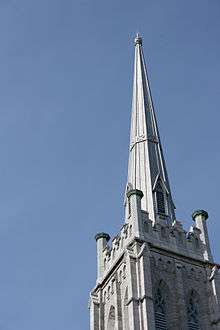 The 1852 church was a stone building 60 by 90 feet (18 by 27 m), with a seating capacity of between 1,000 and 1,200. The cost was about CAN$28,000.[8] Improvements were made later costing CAN$6,000, and the church was reopened on 14 July 1878.[9] Further improvements were made in 1887, when Power and Son of Kingston were responsible for widening the church.[10] The stone building is "plain Gothic" in style. It has tall and narrow windows decorated with tracery. Pairs of lancet openings fill the belfry stage of the tower. The tower has many pinnacles, which used to end in leafy finials, since lost. They punctuate the intricate battlements that surround the narrow spire.[11]