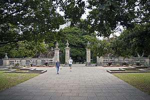 The Botanic Garden once housed a zoo.[2] The zoo was Sydney's first and operated in the Gardens from 1862 until 1883, when most of it was transferred to Moore Park. During these years much of the remnant natural vegetation of the surrounding Domain was removed and planted as parkland. The Moreton Bay Figs, one of the major elements of this planting, continue to dominate the landscape.