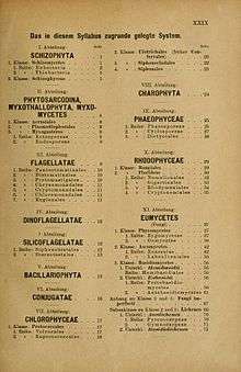 Engler's starting point was that of Eichler who had been the first to use phylogenetic principles, and reflected the new post-Darwinian perspective, although Engler himself did not think that his was.[2] His modified Eichler schema first appeared in 1886 in his Guide to Breslau Botanic Garden[3] (of which he was the director) and was expanded in his Syllabus in 1892.[4] This reflected the new post-Darwinian perspective. Engler's Syllabus der Pflanzenfamilien first appeared in 1892 with the title Syllabus der Vorlesungen über specielle und medicinisch-pharmaceutische Botanik. Many subsequent editions have appeared since, and it was continued after Engler's death in 1930. The most recent edition was the 13th in 2009.[5] A number of references to the Engler system actually refer to later revisions ('modified Engler system') undertaken by Melchior and colleagues, the 12th edition of the Syllabus, also referred to as the Melchior system.