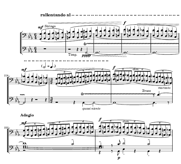 The last four measures return to the initial Adagio tempo. Logically this ought to be faster than the preceding music, which was Adagio then Largamente molto (broadening — that is, slowing — a lot), but most conductors slow down. The strings play a version of the theme from bars 11-12 against a grand C major chord held by the brass and woodwinds. Lionel Pike [12] describes the D to C note progression followed by the B (enharmonically equivalent to C♭) to C progression in the strings as being the final resolution of the tonal dissonance created by the striking A♭ minor chord from near the beginning of the work (also for example the "dissonant" A♭ resolves to "consonant" G in the immediately preceding section). The D to C note progression is also the first two notes of the trombone's recurring "Aino" theme. Arnold Whittall describes this ending as "triumphantly abrupt".[13]