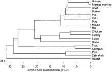 Protein sequence alignment demonstrated that TNNT1 genes are highly conserved among vertebrate species (Fig. 2), especially in the middle and C-terminal regions, while the three muscle type isoforms are significantly diverged among vertebrate species.[6][7]