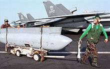 The Tactical Airborne Reconnaissance Pod System (TARPS) is a large and sophisticated camera pod carried by the F-14 Tomcat. It contains three camera bays with different type cameras which are pointed down at passing terrain. It was originally designed to provide an interim aerial reconnaissance capability until a dedicated F/A-18 Reconnaissance version could be fielded. However, it was pressed into service upon arrival in the fleet and was still in use up to the end of Tomcat service in 2006.
