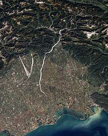 Natural-colour satellite image of north-eastern Italy showing parts of the Cellina, Meduna, and Tagliamento rivers.