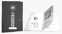 The Republic of China passport (Chinese: 中華民國護照; pinyin: Zhōnghuá Mínguó hùzhào)[1][2][3][4] is the passport issued to nationals of the Republic of China, also known as Taiwan passport or Taiwanese passport.