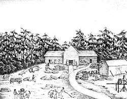 The drawing by Francis Count de Castelnau is captioned with: "Railway depot at Tallahassee. Florida already has a railroad, which although short renders great service. It extends from the capital to Saint-Marck on the Gulf of Mexico about 7 leagues away. It crosses such a very deep sandy region that, before construction, it was scarcely possible to cross it on horseback. It serves chiefly to transport cotton from the interior to the sea."