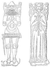 19th-century drawing of Gorges effigies, showing now lost armorial on knight's jupon