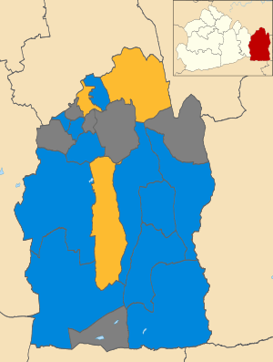 Map of the results of the 2002 Tandridge District Council election. Conservatives in blue and Liberal Democrats in yellow. Wards in grey were not contested in 2002.
