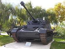 Beginning in 1945,[141] the now-Major Verdeja was ordered to begin designing an artillery piece using a rapid-firing 75 millimeter L/40 howitzer designed by Sociedad Española de Construcción Naval, based on the Verdeja 1 chassis.[142] The chassis' roof and rear wall were eliminated, and instead a gun shield placed over the front. A mechanical brake was installed next to the idler wheel, stopping rearwards movement of the artillery piece during the firing process.[143] The availability of the required parts and the lack of complicated changes meant that the vehicle was quickly prepared and tested extensively. The fate of the self-propelled piece was much the same as that of the Verdeja 2, and the vehicle was left untouched at the proving grounds in Carabanchel until 1973, when it was moved to the Spanish base Alfonso XIII, housing the then Mechanized Infantry Regiment Wad Rass nº 55. It was soon moved to another base, and finally delivered to the base of El Goloso, outside of Madrid, as a part of an armored vehicles museum.[144]