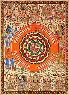 According to David Gordon White, mandalas are a key element of Tantra.[125] They represent the constant flow and interaction of both divine, demonic, human and animal energy or impulses (kleshas, cetanā, taṇhā) in the universe. The mandala is a mesocosm, which mediates between the "transcendent-yet-immanent" macrocosm and the microcosm of mundane human experience.[125] The godhead is at the center of the mandala, while all other beings, including the practitioner, are located at various distances from this center.[125] Mandalas also reflected the medieaval feudal system, with the king at its centre.[126]