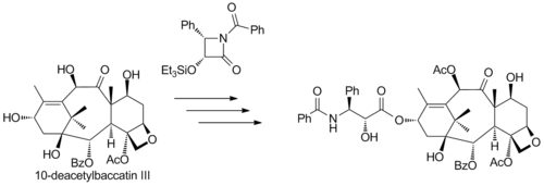 The commercial semisynthesis (by Bristol-Myers Squibb) of paclitaxel starting from 10-deacetylbaccatin III (isolated from the European yew) is based on tail addition of the so-called Ojima lactam to its free hydroxyl group:
