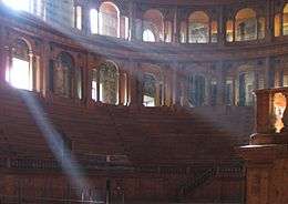 Some claim this as the first permanent proscenium theatre (that is, a theatre in which the audience views the action through a single frame, which is known as the "proscenium arch").[2][3]