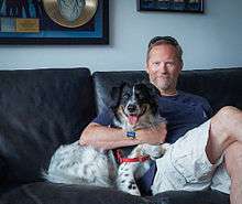 ![]() Jensen in his lounge at Sterling Sound with his dog, Bode | |