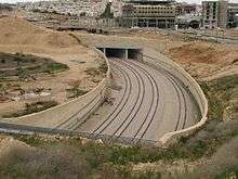 The railway has also been criticized by the political left and the Palestinians for having two separate sections that pass through the West Bank, totaling 6 km. Most of this distance passes through tunnels, one in the Latrun area, and the other just north of Mevasseret Zion, after the town's residents protested the route going underneath the town.[28] For this reason, the German company Deutsche Bahn, which advised Israel Railways on the project, withdrew from it under pressure of pro-Palestinian organizations.[29] The residents of Mevasseret are also waging a campaign in favor of using a tunnel boring machine (TBM) to dig the tunnel in their section.[30] The Italian municipality of Rho near Milan adopted a resolution in November 2011 expressing "moral and political censure" towards Pizzarotti, an Italian company based in Parma, due to its involvement in the construction of the railway.[31] The municipality of Naples similarly asked Pizzarotti to withdraw from the project.[32] It should be noted however, that the section of the railway with which Pizzarotti is involved (i.e., the TBM-bored, western portion of tunnel 3) is not located in the West Bank.
