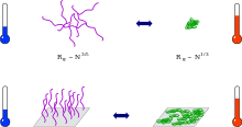 Temperature-responsive polymers or thermoresponsive polymers are polymers that exhibit a drastic and discontinuous change of their physical properties with temperature.[1] The term is commonly used when the property concerned is solubility in a given solvent, but it may also be used when other properties are affected. Thermoresponsive polymers belong to the class of stimuli-responsive materials, in contrast to temperature-sensitive (for short, thermosensitive) materials, which change their properties continuously with environmental conditions. In a stricter sense, thermoresponsive polymers display a miscibility gap in their temperature-composition diagram. Depending on whether the miscibility gap is found at high or low temperatures, an upper or lower critical solution temperature exists, respectively (abbreviated UCST or LCST).
