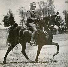 The first horse to be named World Grand Champion was Strolling Jim in 1939. Strolling Jim was a former plow horse retrained for show by Floyd Carothers and Henry Davis, and was only three years old at the time of his win.[7] Although Strolling Jim was a gelding,[7] many World Grand Champions were stallions who became notable sires. Midnight Sun, winner in 1945 and 1946, sired over 2,600 foals,[8] of which five became World Grand Champions. Midnight Sun was ridden and trained by Fred Walker, and owned by Harlinsdale Farm.[9][10][11][12] The World Grand Champion in 1947 and 1948, Merry Go Boy, was known for producing the most desirable Tennessee Walker conformation type in his offspring.[13] The stake is traditionally a stallions' class, and has not been won by a mare or gelding since 1954,[14] when the gray mare Garnier's White Star, owned by W.V. Garnier and ridden by Percy Moss, was crowned as the World Grand Champion. Incidentally, 23-year-old Moss was also the youngest rider to win the stake.[15] The first female rider to win the World Grand Championship was Betty Sain on Shaker's Shocker in 1966.[16] Sain had previously competed in the four-year-old age division and was expected to win the World Championship in that division, but she bypassed the class in favor of the World Grand Championship.[17] The oldest rider to win was 81-year-old Bud Dunn on RPM in 1999. Dunn had previously been the oldest winning rider in 1992, at the age of 74.[18] Although there have been six horses who won the stake two years consecutively, there have been only two three-time winners in the history of the Celebration: The Talk of the Town in 1951, 1952 and 1953, and I Am Jose in 2013, 2014, and 2015. I Am Jose was also notable for being the first four-year-old winner since 1966.[19]