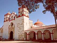 The two main landmarks in the town are the Preciosa Sangre de Cristo Church and the Community Museum. The Preciosa Sangre de Cristo Church is the main church of the town and municipality and was begun in 1581,[1] although not completed until 1758.[3] The facade of the church is made of quarried stone called cantera with decorative stonework in the main entrance and choir window. This church was built on the site of a local Zapotec temple, which was destroyed when the Spanish arrived, replacing it with this church. In the foundations of the church, some of the construction of the original temple can be seen. On the side of the church is a small archeological area.[5] Inside there are traces of 16th century decoration with pre-Hispanic motifs.[4] The interior is also notable for a large number of colonial-era santos or statues of saints, many executed in fine polychrome that is well preserved to the present day.[6] Another religious attraction is the Chapel of Cristo Grande located in a private home on Aquiles Serdan Street.[3]