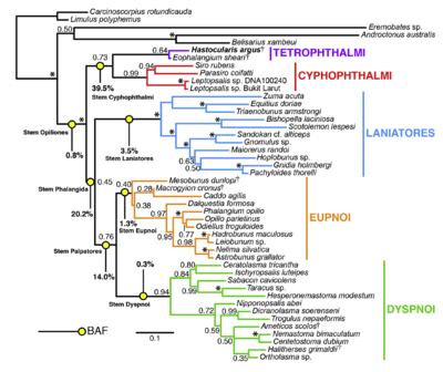 Another recent phylogeny recovered Hastocularis as an early banching opilionid in the harvestman tree, along with the Cyphophthalmi.[5] Eophalangium, the other genus in Garwood et al.'s Tetrophthalmi was recovered in a polytomy with the remaining oplionids, however.