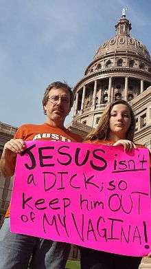 Images of the placard carried by pro-choice activists Billy Joe Cain, his daughter Tuesday, with the message "JESUS isn't a DICK; so keep him OUT of MY VAGINA!" went viral, the resultant controversy was reported nationally and internationally.[36][37][38]