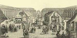 The earliest references to the annual fair date to 1176. The fairground itself was established in 1482 by Louis XI for the benefit of the Abbey of Saint-Germain-des-Prés and was located near the Abbey on the Left Bank southwest of the city center just outside one of the gates of the city wall built by Philip II at the beginning of the 13th century. The covered Saint-Germain market today occupies part of the former fairground site with access from the Boulevard Saint-Germain via the Rue de Montfaucon (satellite view).[1] The fair generally lasted three to five weeks around Easter. During the 18th century it consistently opened on 3 February and lasted until Palm Sunday.