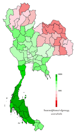 There were considerable differences in the approval rates between the regions of Thailand. In six provinces of Southern Thailand (Chumphon, Trang, Nakhon Si Thammarat, Songkhla, Surat Thani, Ranong), the approval topped 90%. On the other hand, in 24 provinces in Northern and Northeastern Thailand there was a majority against the draft. In two provinces in the far Northeast (Nakhon Phanom, Roi Et), the rejection even topped 75%.