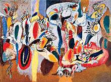 Arshile Gorky, The Liver is the Cock's Comb (1944), oil on canvas, 7314 × 98" (186 × 249 cm) Albright–Knox Art Gallery, Buffalo, New York. Gorky was an Armenian-born American painter who had a seminal influence on Abstract Expressionism. De Kooning said: "I met a lot of artists — but then I met Gorky... He had an extraordinary gift for hitting the nail on the head; remarkable. So I immediately attached myself to him and we became very good friends."[13]
