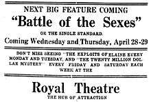 The Battle of the Sexes was the second D. W. Griffith feature to be released to the public, following Biograph's long-delayed release of Griffith's first feature, Judith of Bethulia, by barely more than a month. He had already begun The Escape (1914), but production had been stopped by actress Blanche Sweet's spell of scarlet fever, and the Reliance-Majestic Studio was already in trouble and in need of a viable Griffith property, fast.[4] Griffith decided on a scenario entitled "The Single Standard," written by in-house screenwriter Daniel Carson Goodman and filmed at the Reliance studio in New York City, rather than at the Hollywood studio, which was still being built. According to Lillian Gish, The Battle of the Sexes was shot in only five days.[5] Although the film was complete by February, its release was delayed two months more. Several reasons have been advanced for the impasse, but scholar Paul Spehr has suggested that both Reliance-Majestic and its distributor, Mutual, were having difficulty developing an effective distribution strategy for longer, multi-reel films in a market still dominated by one- and two-reel subjects.[6] The Battle of the Sexes was premiered at Weber's Theater in New York City on April 12, 1914, and was a considerable success; the first one Griffith enjoyed with his name over the title.