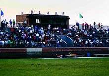 Blake competes in the Independent Metro Athletic Conference (IMAC) and formerly in the Tri-Metro Conference,[16] which is part of the Minnesota State High School League. The school athletic teams are named the Blake Bears,[3] with the school colors being royal blue, kelly green, brown, and white. The school offers twenty-eight sports, and fields over fifty athletic teams. The school also recognizes four club sports, including Ultimate Frisbee, Equestrian Team, Sailing, and the Stepps Dance Team.[17] They are also recognized for having their hockey team in a cameo for the 1996 Disney movie D3: The Mighty Ducks when the movie was shot on set at Blake's Hopkins campus hockey arena; they came from behind down 9-0 to tie the Ducks 9-9, with 9 third period goals.