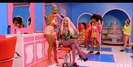 Minaj and Cassie go through many costume changes in the video. Various clips of Minaj and Cassie appear as the chorus goes, including Minaj bouncing on the ball as she raps along. Minaj then starts the second verse inside of a colorful beauty salon, sporting a pink wig, getting her hair done. Dancers are seen doing choreography in the salon and Cassie begins to sing the chorus again while sitting down in the same setting, dressed in a blue men's suit, holding a stack of money that she proceeds to throw in the air as she joins the dancers. Minaj is now rapping the last verse of the track and opens the scene with a flamethrower, donning a blonde wig, wearing a denim bra and a skirt, in a crime scene set in a burnt down barbershop, with blazing blue flames and unconscious men behind her. More clips from previous scenes of Minaj and Cassie interacting are continuously shown throughout the visuals. Towards the end of the music video, Minaj is seen playing with her hair, as Cassie appears in another scene sitting on a lip shaped couch and Minaj smiling in her T-Rex automobile.[39][40][41]