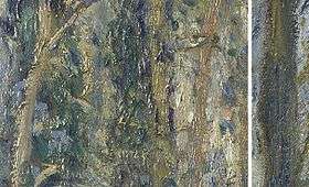 The same year Pissarro painted The Côte des Bœufs at L’Hermitage, his friend Paul Cézanne painted his The Orchard, Côte Saint-Denis. The two artists had been friends for many years and had collaborated on a large number of works between 1865 and 1885. This Cézanne painting was also displayed, along with Pissarro’s Côte des Bœufs and Renoir’s Bal and other paintings, in the third gallery at the exhibition, but it was listed in the catalogue simply as being one of four examples of Cézanne’s Paysage; Etude d’après nature.[17] Although the place-names in the latterly adopted titles of both the Cézanne painting and the Pissarro painting refer to the same location, it is not clear that both paintings actually show exactly the same spot. However, a number of very obvious themes such as those of the strongly coloured roof tiles, the precipitously dropping hillside, and of buildings seen through trees, are common to both pictures.[18][19]