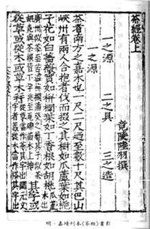The Classic of Tea or Tea Classic (simplified Chinese: 茶经; traditional Chinese: 茶經; pinyin: chájīng) is the first known monograph on tea in the world, by Chinese writer Lu Yu between 760 CE and 762 CE, during the Tang Dynasty.[1] Lu Yu's original work is lost; the earliest editions available date to the Ming Dynasty.[2]