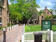 All sororities are located near the Old Campus of the College, in a complex known as "Sorority Court", on Richmond Road directly across from the Wren Building and the President's House. There are twelve individual houses in the complex. Sorority Court is within walking distance of Merchants Square in Colonial Williamsburg and of the campus quadrangle known as the Sunken Garden.