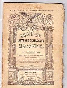 "The Conqueror Worm" was first published as a stand-alone poem in the January 1843 issue of Graham's Magazine.[1] Shortly after, it was included among several other poems by Poe in the February 25 issue of the Saturday Museum in a feature called "The Poets & Poetry of Philadelphia: Edgar Allan Poe".[2] It was later included in Poe's poetry collection The Raven and Other Poems in 1845.[1] That same year, it was incorporated into "Ligeia" for the first time when the story was reprinted in the February 15, 1845, issue of the New York World.[3] "Ligeia" was again republished with "The Conqueror Worm" in the September 27, 1845, issue of The Broadway Journal while Poe was its editor.[4] This was not unusual for Poe, who had also incorporated poems "The Coliseum" and "To One in Paradise" into tales.[5]
