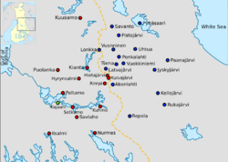 Elias Lönnrot departed on the first part of his ninth field trip on 16 September 1836. He was granted a 14-month leave of absence and a sum of travelling expenses from the Finnish Literary Society. His funds came with some stipulations: he must travel around the Kainuu border regions and then on to the north and finally from Kainuu to the south-east along the border. For the expedition into the north he was accompanied by Juhana Fredrik Cajan. The first part of the trip took Lönnrot all the way to Inari in northern Lapland.[29] The second, southern part of the journey was more successful than the northern part, taking Lönnrot to the Russian town of Sortavala on Lake Ladoga then back up through Savo and eventually back to Kajaani. Although these trips were long and arduous, they resulted in very little Kalevala material; only 1,000 verses were recovered from the southern half and an unknown quantity from the northern half.[30]